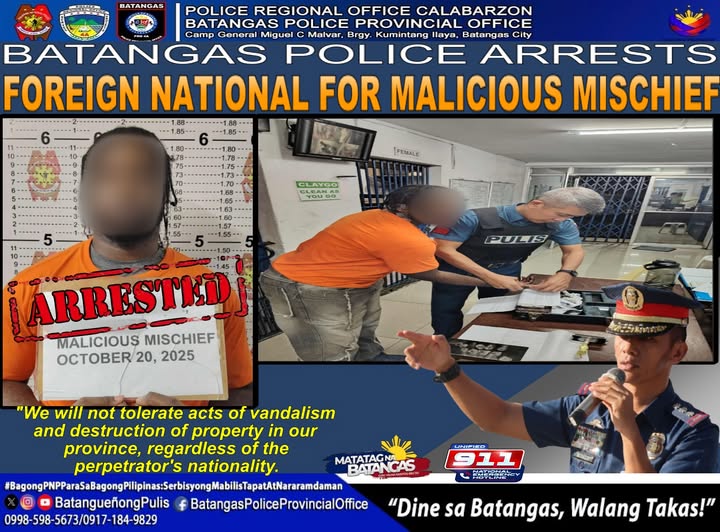 Police in Batangas have arrested a 27-year-old foreign national accused of causing significant damage to a rented house in Barangay
